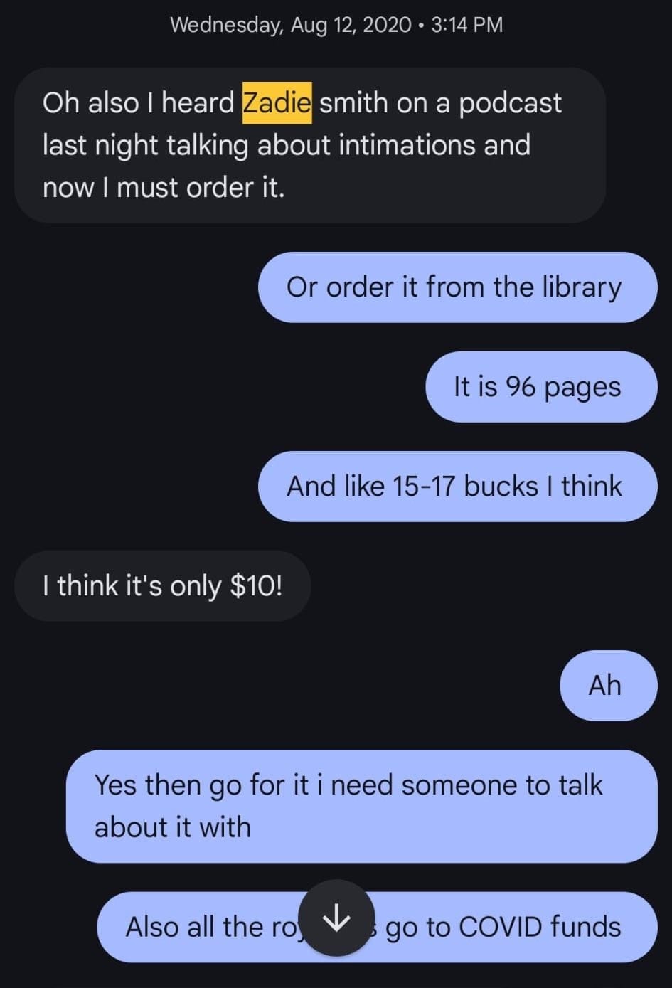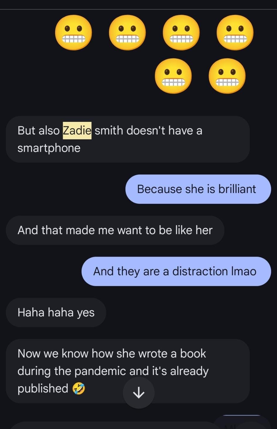 An awed text message exchange between Maggie and Latria in 2020 about Zadie Smith owning a flip phone. (Photos courtesy Latria Graham)